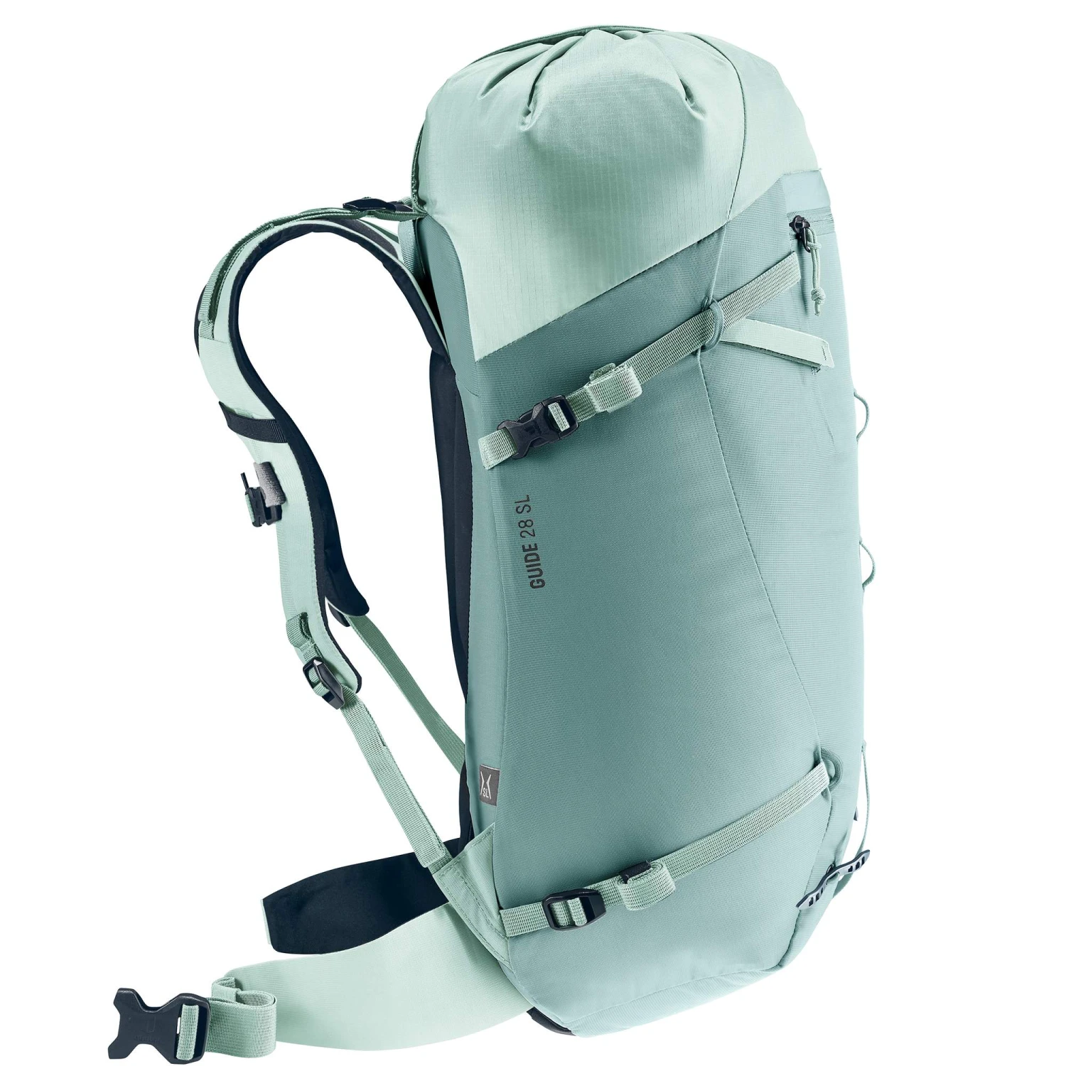 Statt eines Deckels hat der Guide 28 SL eine vereinfachte Deckelkonstruktion bestehend aus einem Flap mit Metallhaken und einem Kordelzug. Dies ermöglicht einen einfacheren und schnelleren Zugriff auf den Rucksackinhalt. Besonders praktisch, wenn du in der Vertikalen hängst. Gleichzeitig dient der Verschluss als Helmhalterung.