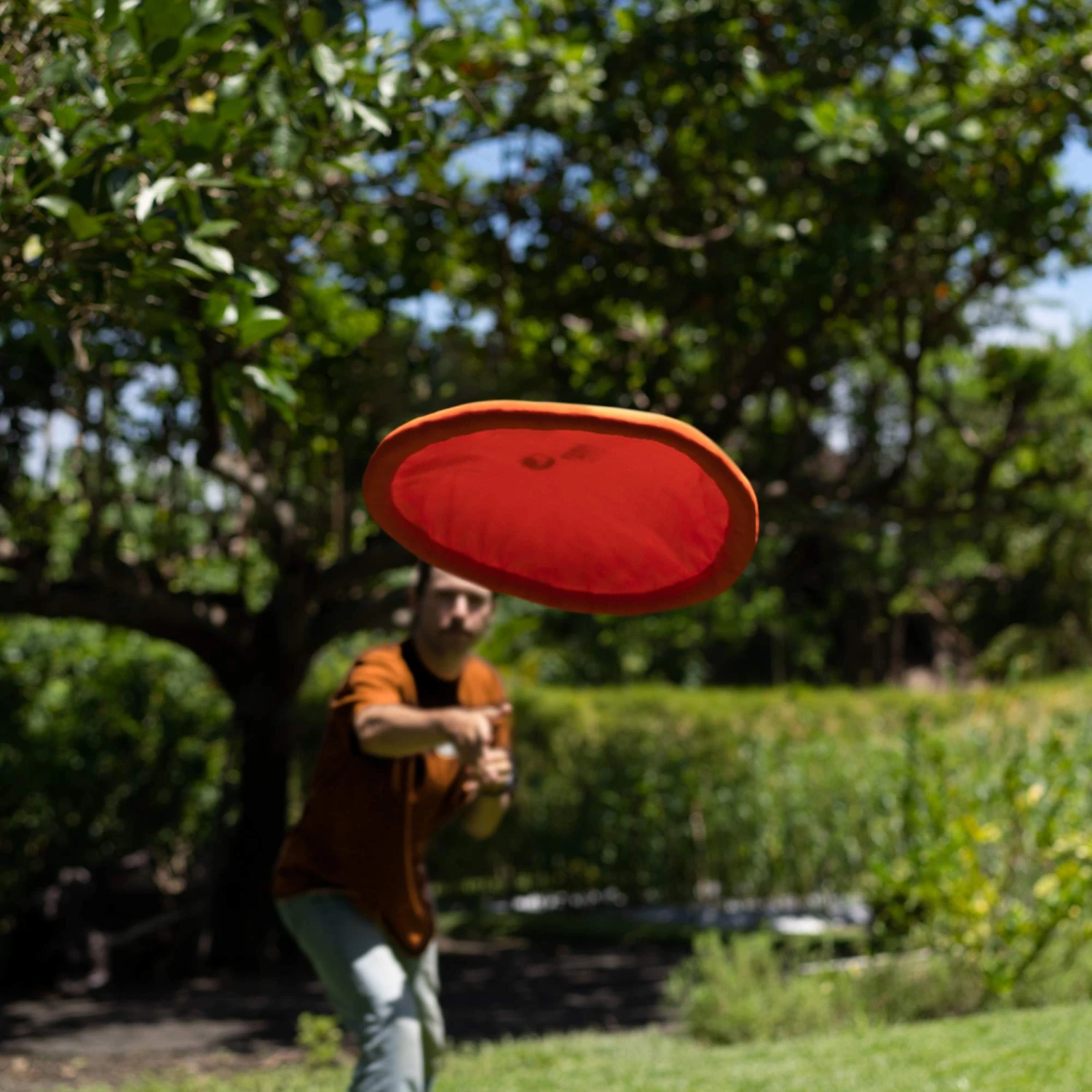 Weiche Frisbee, gute Flugeigenschaften: Durch die flexible Machart an vielen Orten einsetzbar. Der Rand ist weich, rund im Querschnitt und fingerdick. Der Stoffbezug ist aus robustem Hängemattenstoff.